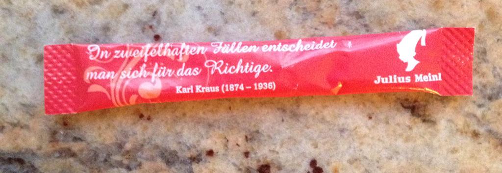 Das Zitat auf der Zuckerverpackung stimmt nicht. Es ist ein Buchstabe zuviel; richtig wäre: "entscheidE" statt "entscheideT". Damit ist es der Firma "Julius Meinl" gelungen, einen Aphorismus von Karl Kraus durch die Zugabe eines Buchstabens seines Witzes zu berauben und glückskeksetauglich zu machen.