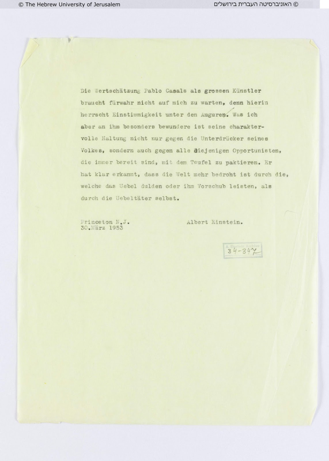 Albert Einstein: Typoskript, Princeton, 30. März 1953, Einstein Archive 34 - 347, The Hebrew University of Jerusalem