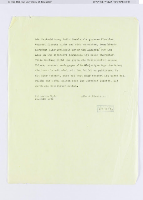 - "Die Wertschätzung Pablo Casals(') als grossen Künstler braucht fürwahr nicht auf mich zu warten, denn hierin herrscht Einstimmigkeit unter den Auguren. Was ich aber an ihm besonders bewundere, ist seine charaktervolle Haltung nicht nur gegen die Unterdrücker seines Volkes, sondern auch gegen alle diejenigen Opportunisten, die immer bereit sind, mit dem Teufel zu paktieren. Er hat klar erkannt, dass die Welt mehr bedroht ist durch die, welche das Uebel dulden oder ihm Vorschub leisten, als durch die Uebeltäter selbst.